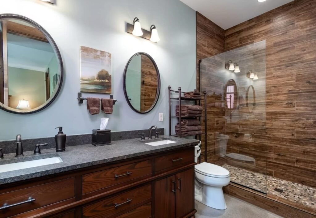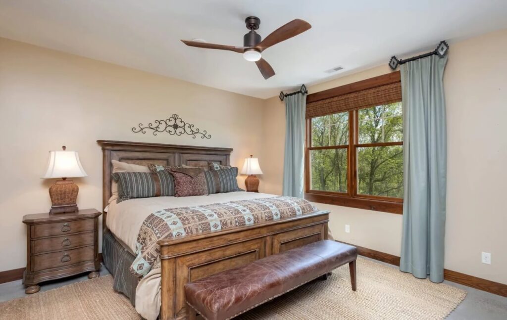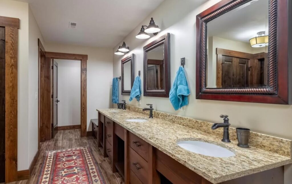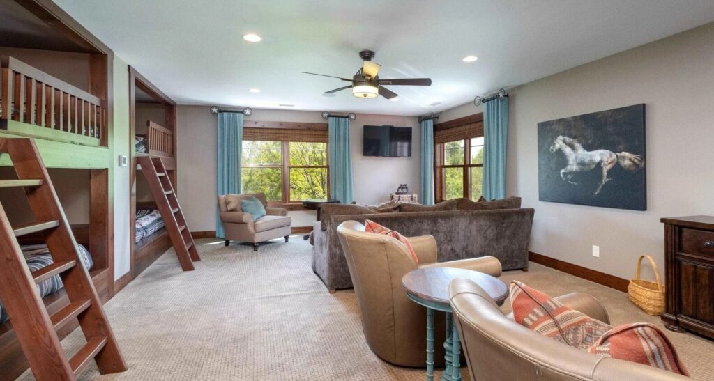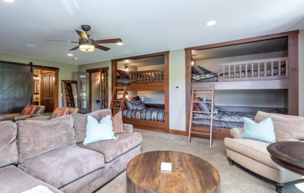 - Bunk Room: The upstairs area features four built-in queen beds and a camp-style bathroom with multiple sinks, toilets, and showers.
